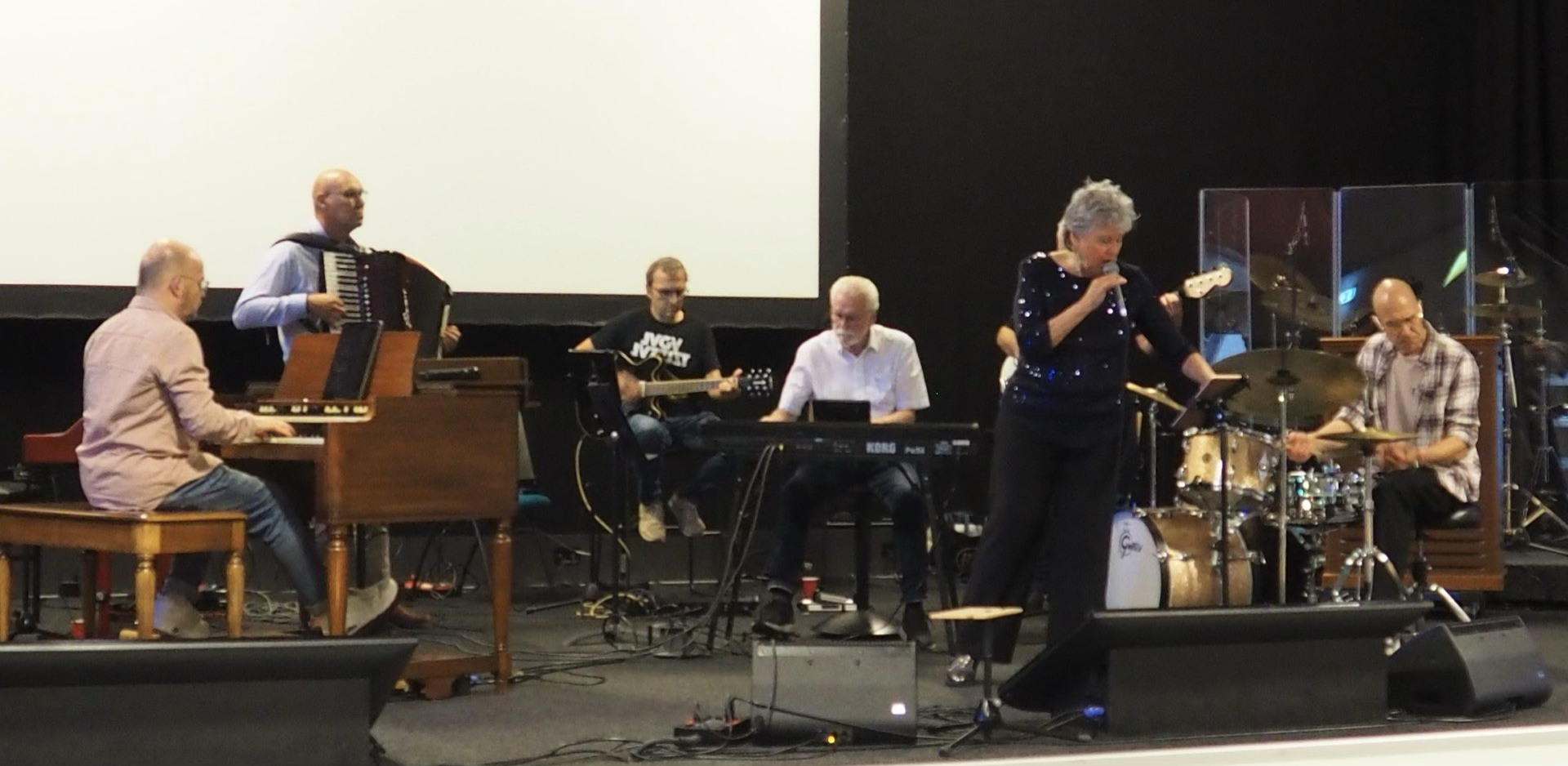 Tijdens het eerste nummer sprong de beamer aan door een druk op wat de juiste knop bleek te zijn. Eureka! Er was beeld! Respect voor Harry, die zowel beeld als geluid als catering georganiseerd probeerde te krijgen en daarbij wat tegenslagen te verwerken kreeg.