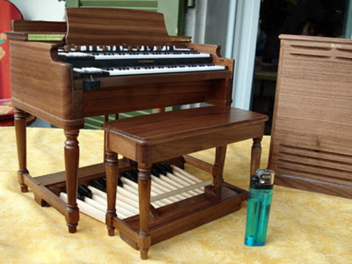 Hieronder een prachtig staaltje miniatuur-schrijnwerk, een B3 met Leslie. Let op de aansteker!
