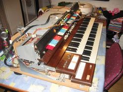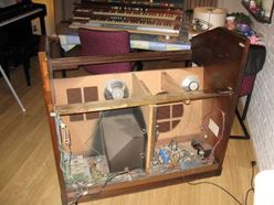 Om te beginnen heb ik het orgel aan de achterkant geopend en eerst eens grondig bestudeerd hoe alle electronische verbindingen tussen de bovenkant en de onderkant waren. Daarna al die verbindingen losgemaakt, dat was makkelijk, want het meeste bestond uit stekkerverbindingen. Uiteindelijk heb ik maar één kabeltje moeten