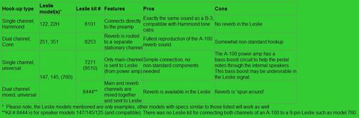 En tot slot nog even een overzichtje met welke kit welke Leslie aangesloten kan worden: