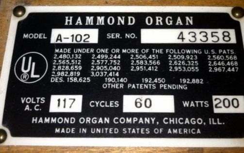 Dit is het serienummerpolaatje van de A-105 van de Rolling Stones.