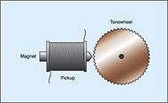 Dit golfpatroon is sinusvormig. Vlak voor de rand van dit z.g. toonwiel wordt een pickupelement geplaatst. Deze pickup bestaat uit een magnetische kern met een spoel eromheen. Als het toonwiel draait wordt er in de kern een wisselend magnetisch veld opgewekt, wat in de spoel resulteert in een elektrische wisselspanning.