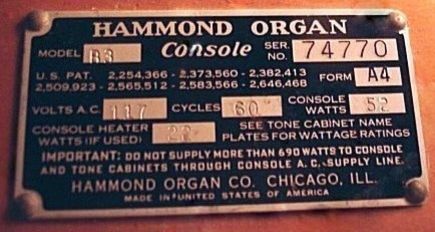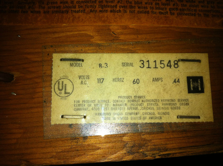 Dan nog het serienummerplaatje van een B-3. Oorspronkelijk had men metalen serienummerplaatjes, doch latere versies hadden geniete papieren exemplaren, die daardoor gemakkelijk teloor gingen indien deze aan de buiten- of onderzijde van het instrument waren bevestigd. Latere versies hebben altijd een papieren serienummerplaatje, met daarnaast soms een tweede onder de toonwielgenerator in de bodem of in de zijkant ontoegankelijk naast de klavieren van het instrument geniet.