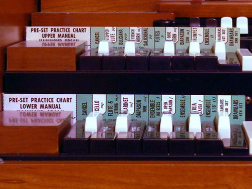 De preset toetsen worden als volgt gebruikt: de B is voor de linkerset drawbars van het betreffende manuaal, de Bes is voor de rechterset drawbars van het betreffende manuaal. De rest van de presettoetsen ligt vast. Deze zijn overigens wel te wijzigen. Daartoe moet het orgel aan de achterkant worden opengemaakt. Aan de linkerkant van het orgel zitten de presetrails waar draden met behulp van schoefjes op bepaalde punten kunnen worden vastgezet.