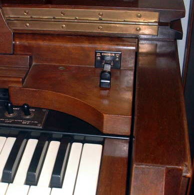 Als je normaal speelt, horen wij de bekende strakke toon. Trekken wij nu aan de rechterkant van het orgel, naast de drawbars van het lower manual, een vrijstaande zwarte drawbar uit, dan wordt met behulp van een schakelaar de chorusgenerator toegevoegd en horen wij een prachtige dragende licht zwevende toon. Dit is werkelijk een schot in de roos.
