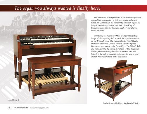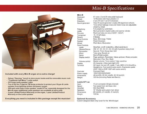 The Hammond "Mini-B" carries on the legend, offering the sound and response that has made music a grander place. No matter what style of music you play, no matter the denomination of your church, the Mini-B plays like tradition, sounds like tradition and now looks like tradition.