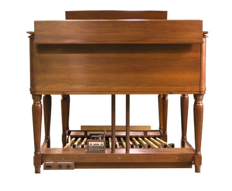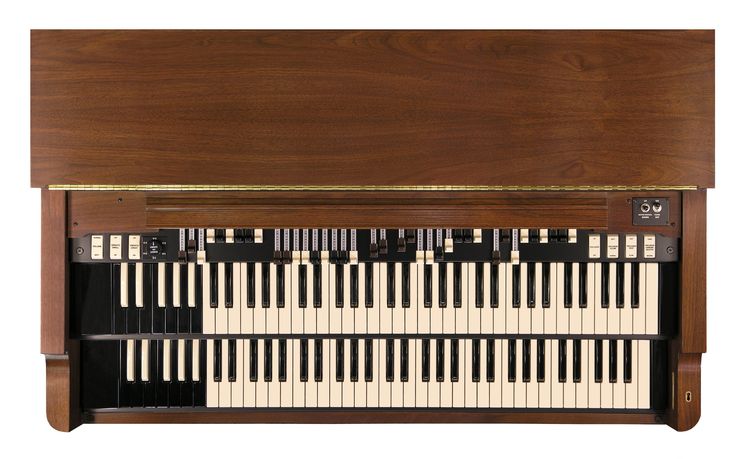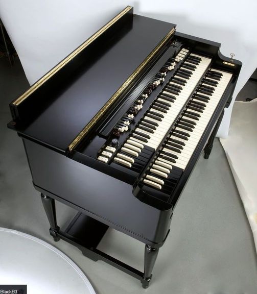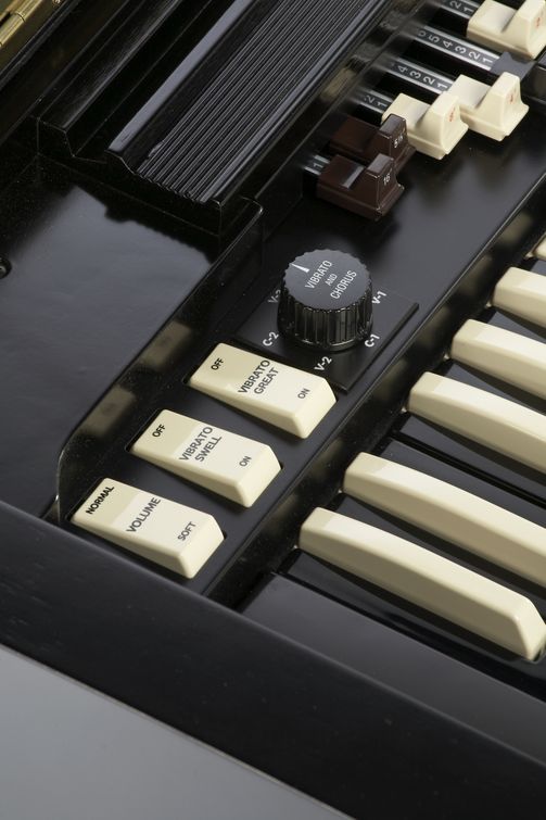 Je kunt gemakkelijk zien of het een oude of nieuwe B-3 is. Rechts van de knieën van de organist zit bij de nieuwe B-3 een blokje. Daarachter zit het regelmenu voor diverse parameters. Linksonder zitten potmeters voor de toonregeling.