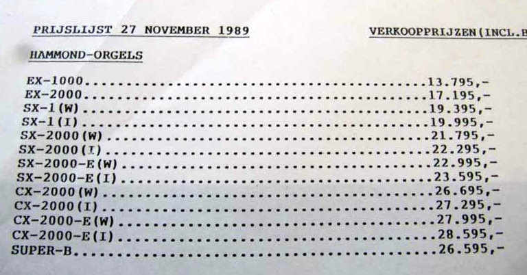 Hier even een stukje prijslijst (vanzelfsprekend nog in onze trouwe oude gulden) uit die tijd. De W staat voor Wood / hout fineer en de I staat voor Ivory / ivoorwit hoogglans.