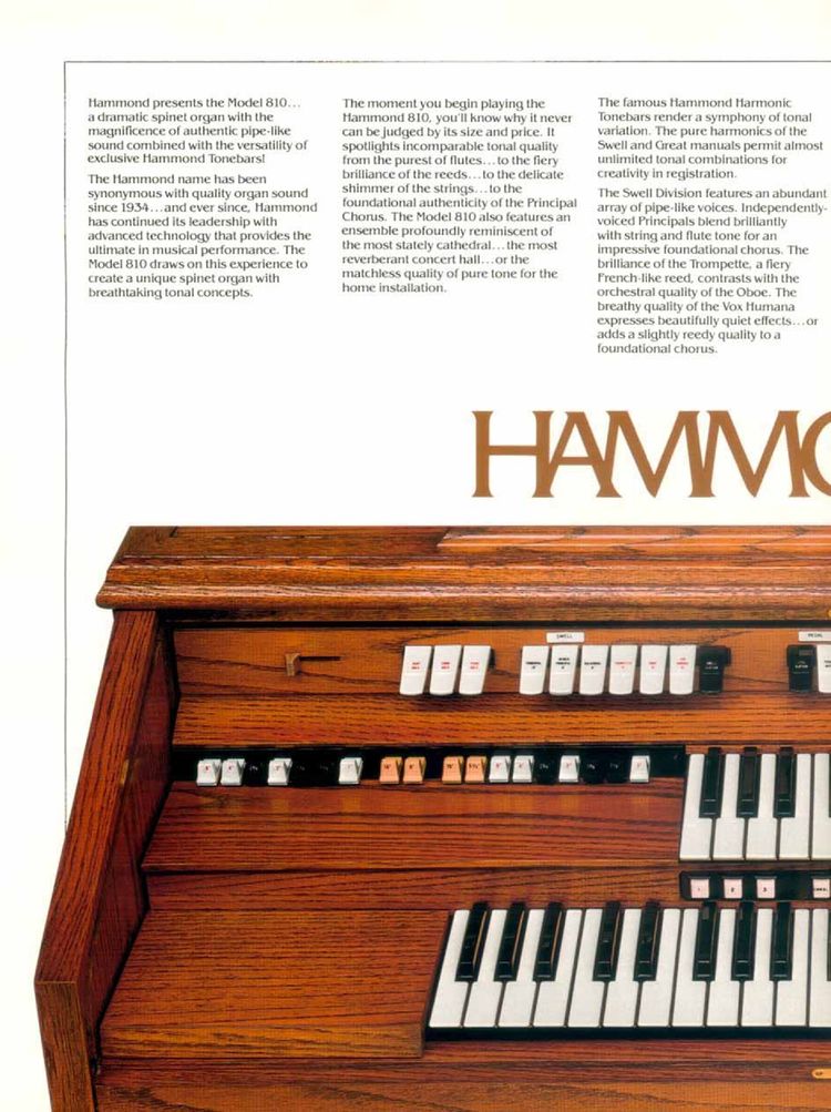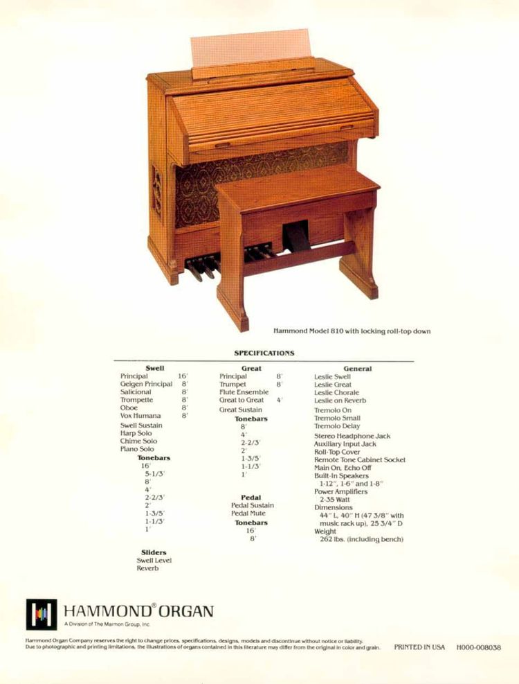 De Hammond 800 series is gebouwd als vervanger van de in kerken gebruikte A's, B's en C's, waarvan nog tienduizenden exemplaren nog steeds voor vaak, swingende diensten zorgen. Er zijn ook wat klassieke stemmen toegevoegd, waaronder strings en voor de Amerikaanse markt een carillion. Het orgel doet qua registratie ook een beetje denken aan de klassieke Monarch (de 16262) van weleer. Opvallend is, dat dit "church-model" twee klavieren van slechts 3,5 octaven meekreeg.