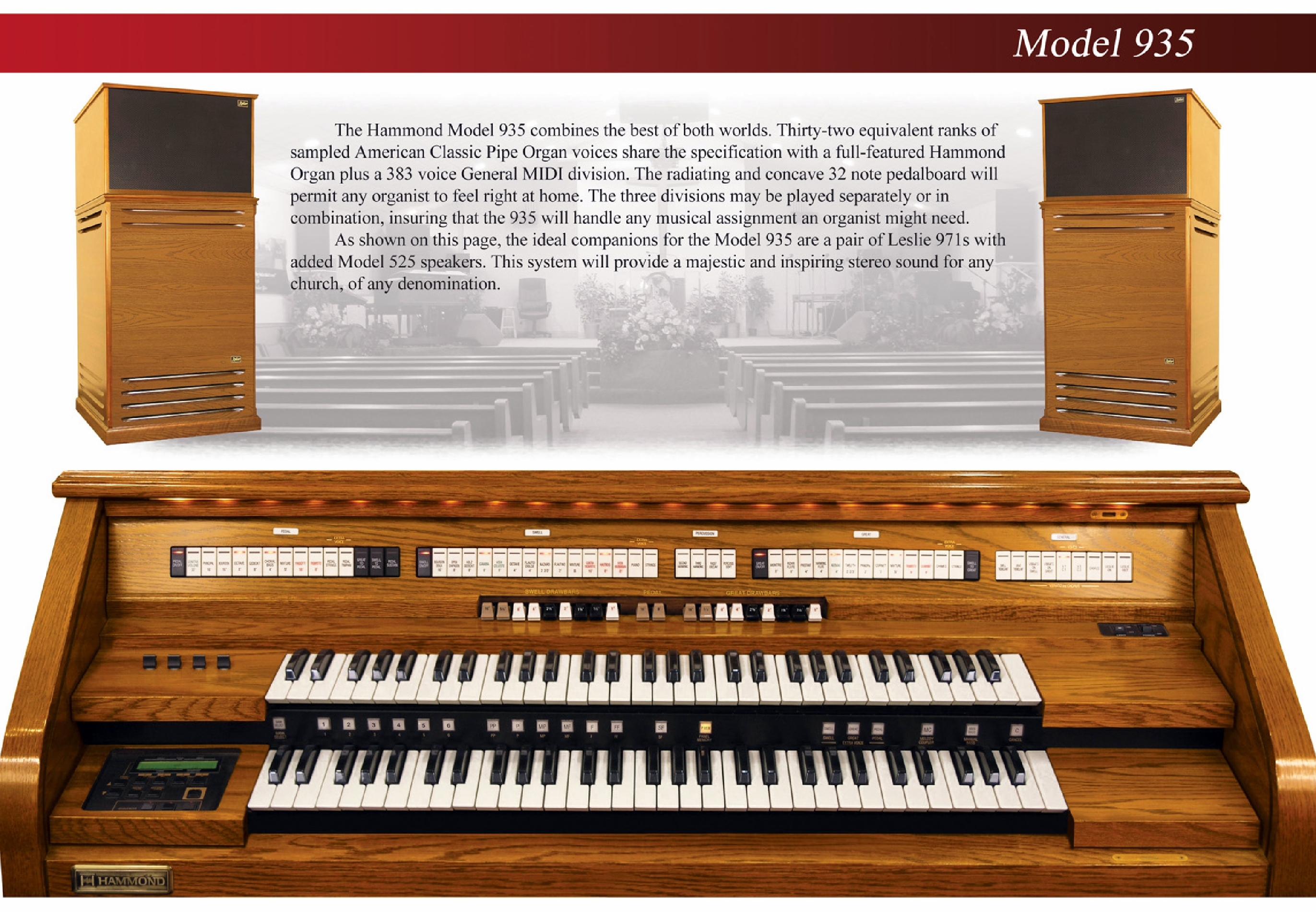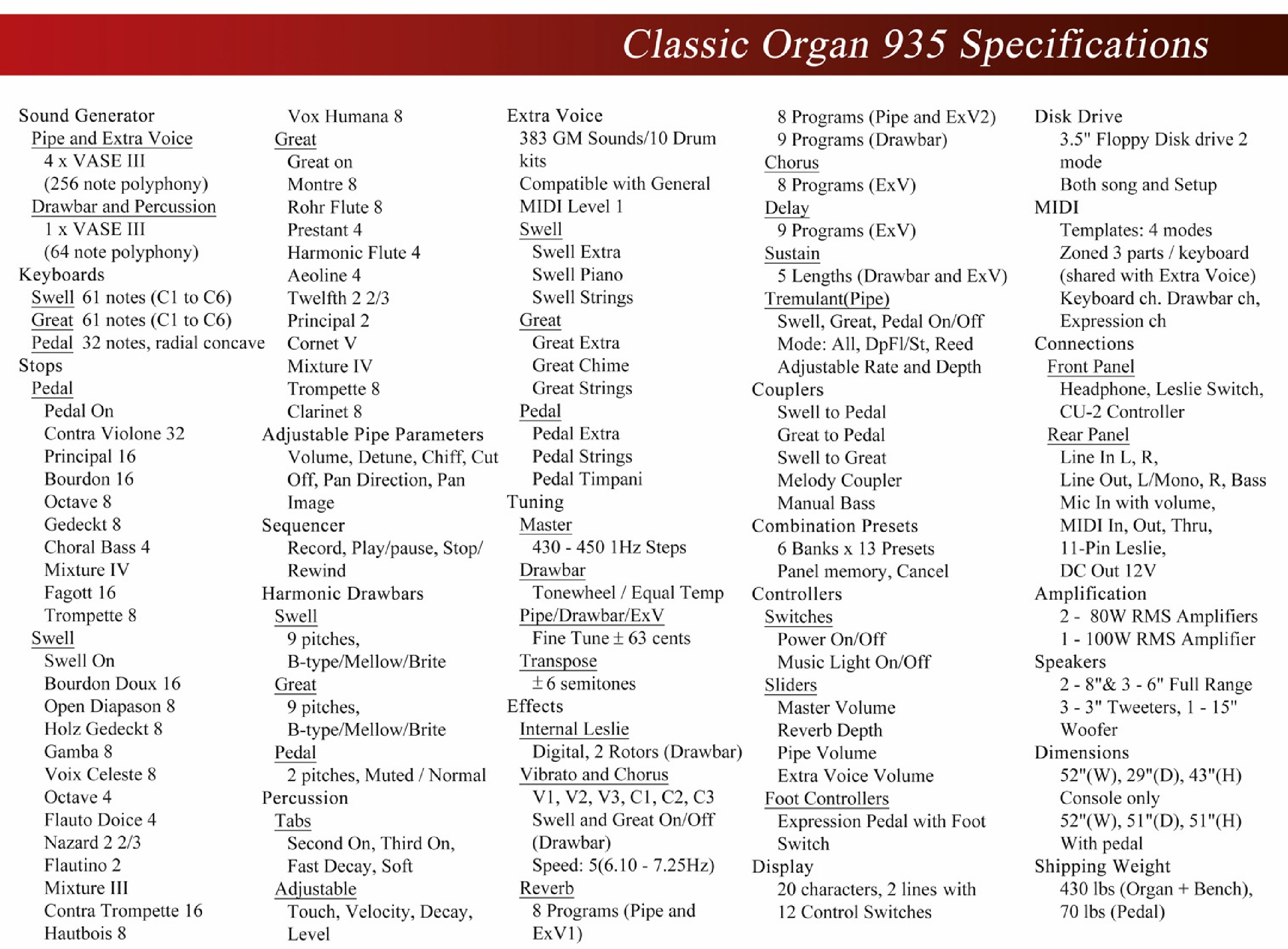 Naast zijn "Amerikaanse orgelgeluid" en de klassieke stemmen biedt dit orgel ook een scala aan extra stemmen zoals Grand Piano, Strings en koorgeluiden.