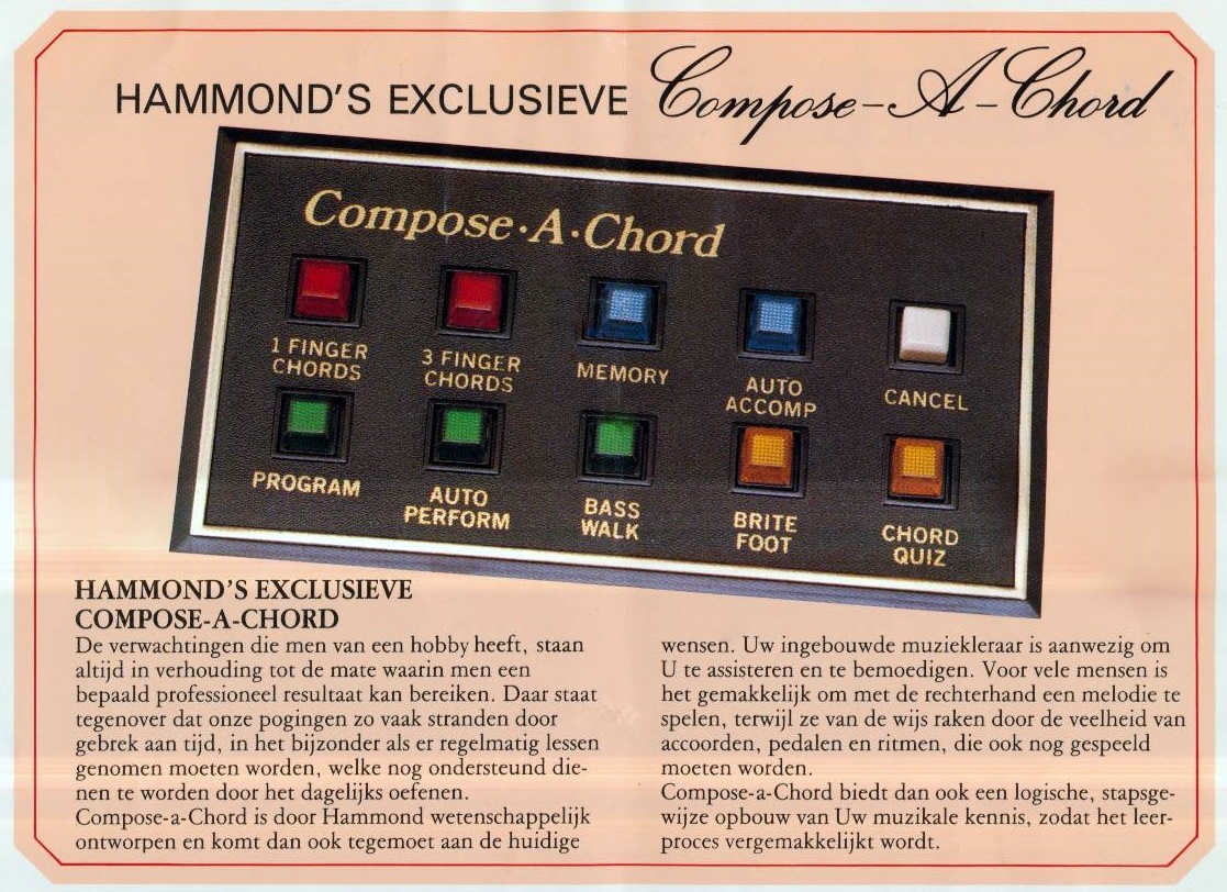 De naam Composer doelt op de functie "Compose-A-Chord " hetgeen duidt op het kunnen programmeren/opnemen van een akkoorden lijn. Dat was een hele tour en menig organist lukte het niet.