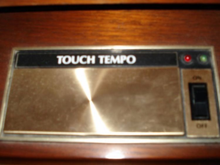 en off you go. Het ritme werd dan in die snelheid afgespeeld, zoals je dat zelf ingaf. Heel gemakkelijk en heel praktisch. Touch tempo was een uitvinding van de latere Roland-oprichter Kakehashi en werd gebruikt in de Ace Tone FR8L (het ijzeren plaatje links op de voor/bovenkant).