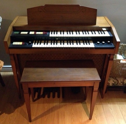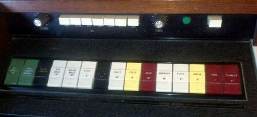Tonal controls:16 voice tabs. Upper manual has five 8' voices and three 16' voices.