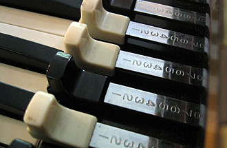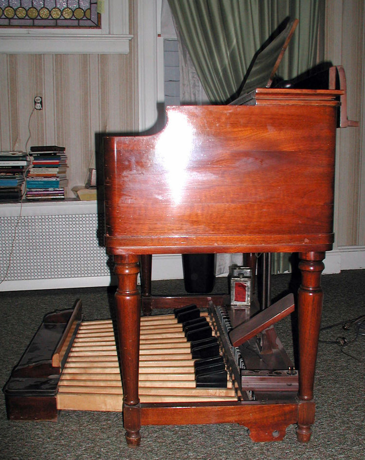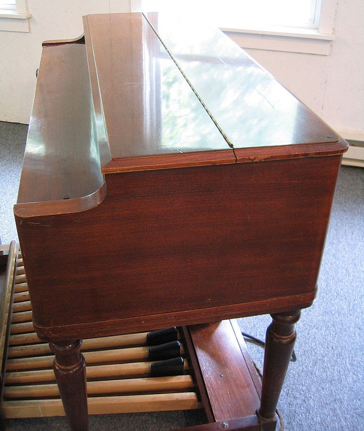 Hieronder het exemplaar met serienummer 6. Merk op, dat destijds de lessenaar nog dubbelgeklapt moest worden. Later werd hij uit één geheel gemaakt en voorover platgelegd onder de klep.
