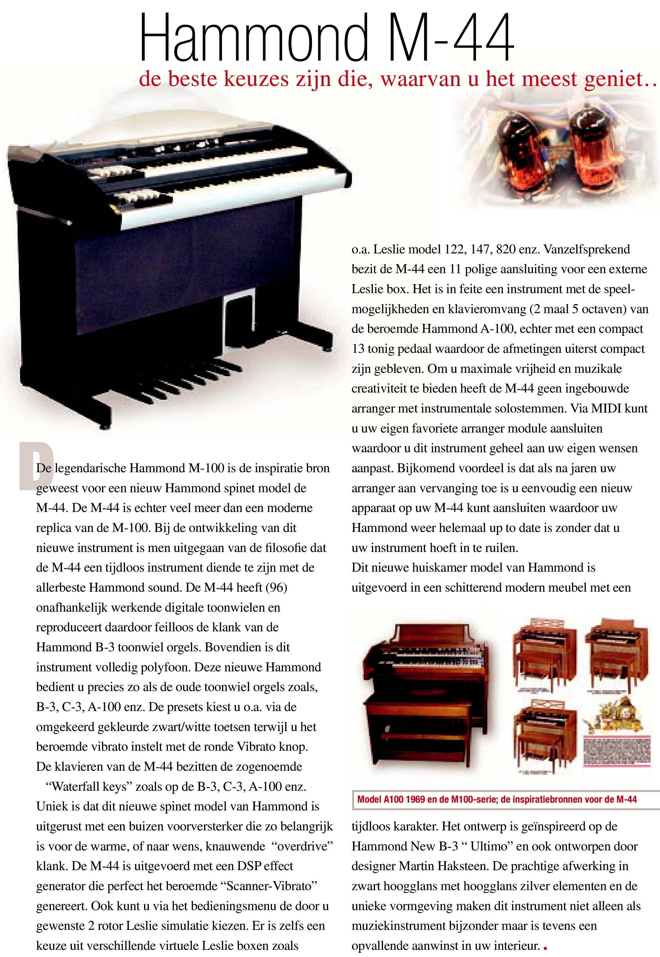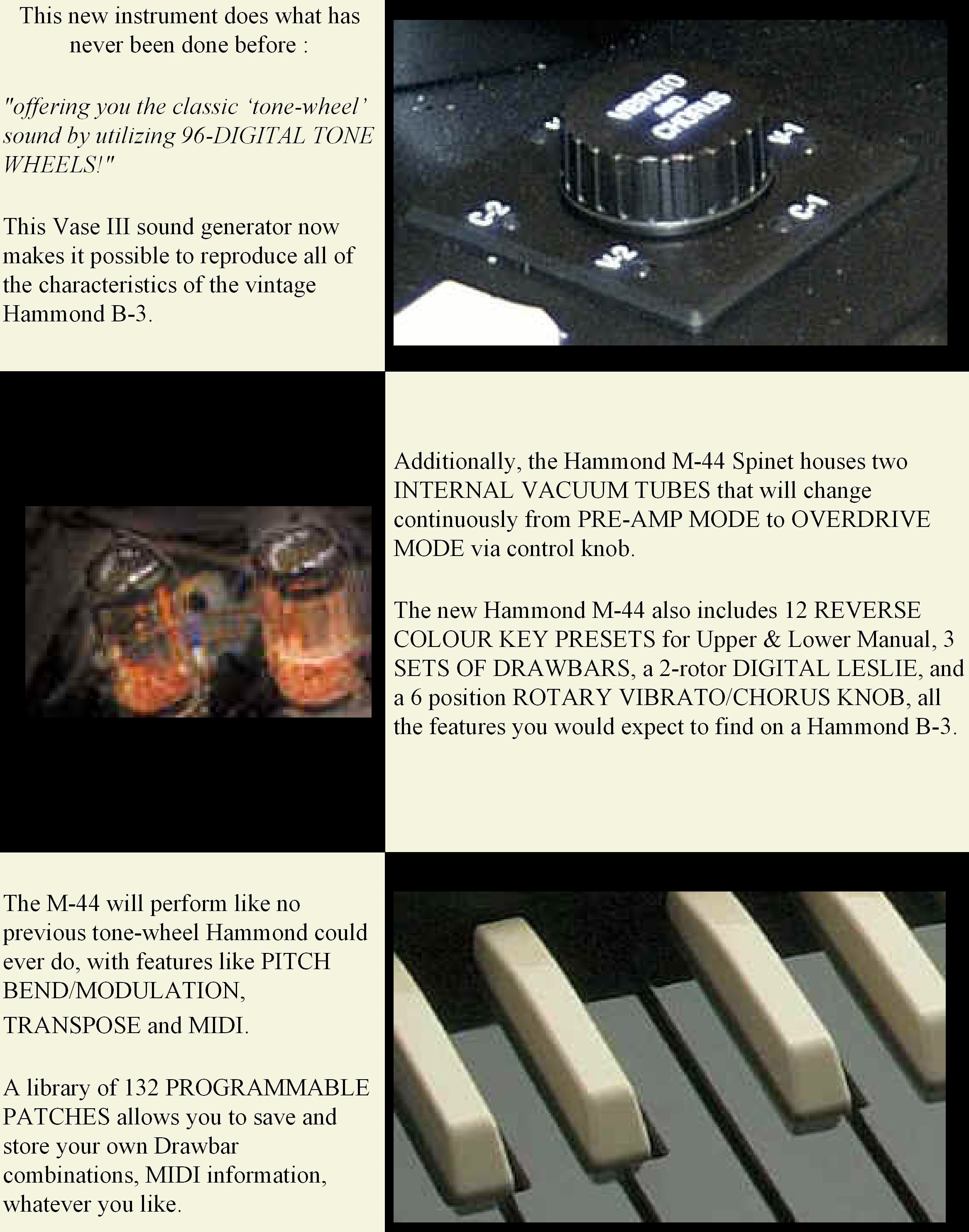 Omdat het instrument alle techniek in zich heeft van de NEW B-3 en 96 [!] virtuele toonwielen heeft en ook beschikt over de aangename 2 x 5 octaafs "Waterfall" klavieren, hebben we toch besloten voor de overzichtelijkheid van deze site dit type niet onder de B te plaatsen maar onder de M. We moeten consistent blijven nietwaar.....