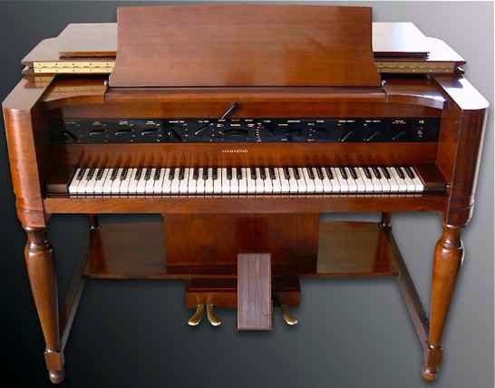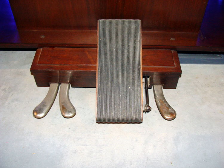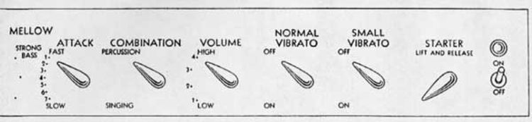 De meest linkse laat , net als vroegere piano's alleen het linker-deel van de Novachord doorklinken,ook duidelijk is het zwelpedaal te zien: