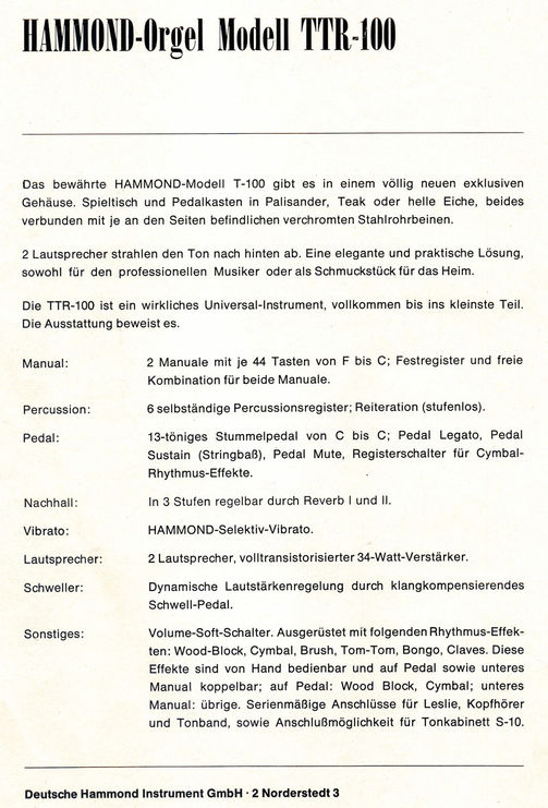De TTR 100 is een design variant op de T serie en had ook op het rechter bakstuk knoppen, die elk een van de 6 drumgeluiden lieten horen. Deze effecten konden ook aan het onderklavier en het pedaal gekoppeld worden.