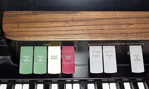 De plaatsing van de Leslie-fast regelaar (rood) is ook een beetje zonderling, maar nogmaals, dit orgel is niet gemaakt voor rock 'n roll. Doch een Leslie schakelaar hoort links onder handbereik te zitten en niet boven de speeltafel op het paneel ook al zit hij hier dan meest rechts.