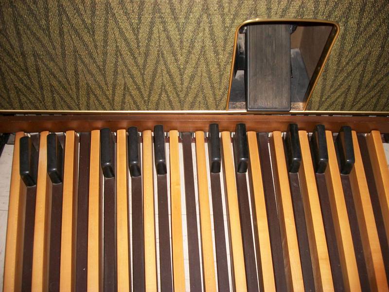 (tussen de klavieren de witte, ronde preset schakelaars)