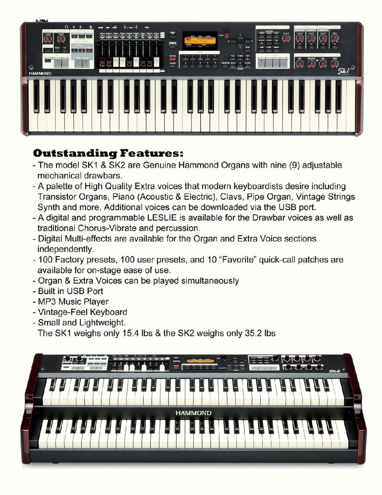 The SK Series Stage Keyboards are the most revolutionary HAMMONDS yet, from the company that invented and perfected the Drawbar/Tonewheel concept in 1934. These ultralight instruments provide the essential keyboard sounds required to play ANY show in ANY style, including a genuine and vintage-perfect HAMMOND Organ in compact packages with all the features expected in a vintage B-3, plus our most advanced Digital Leslie yet.