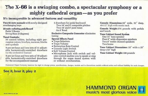 In 1965 was het instrument speelklaar, uiterlijk uitgevoerd in een futuristische look en inwendig uitgevoerd met voor die tijd revolutionaire nieuwe technieken, zodat de X66 koploper in zijn klasse zou zijn. Volgens de Hammond Organ Company was de X66 het ultieme instrument dat iedere competitie met de concurrentie zou kunnen aangaan.