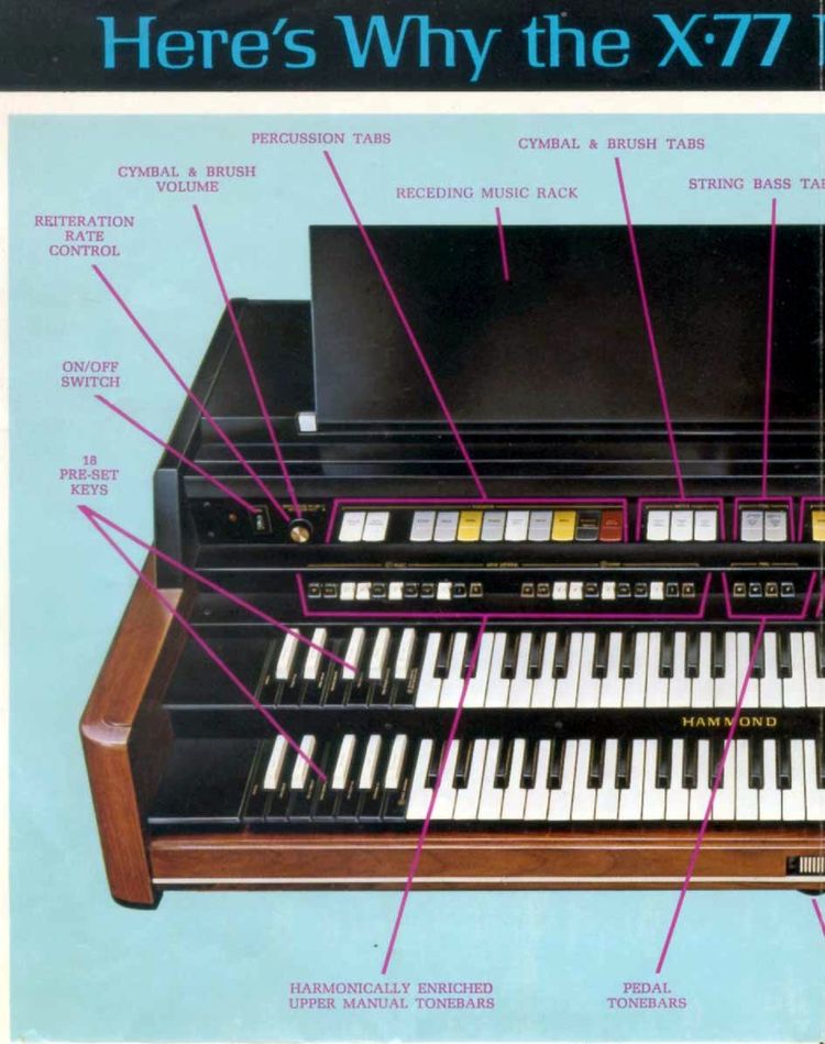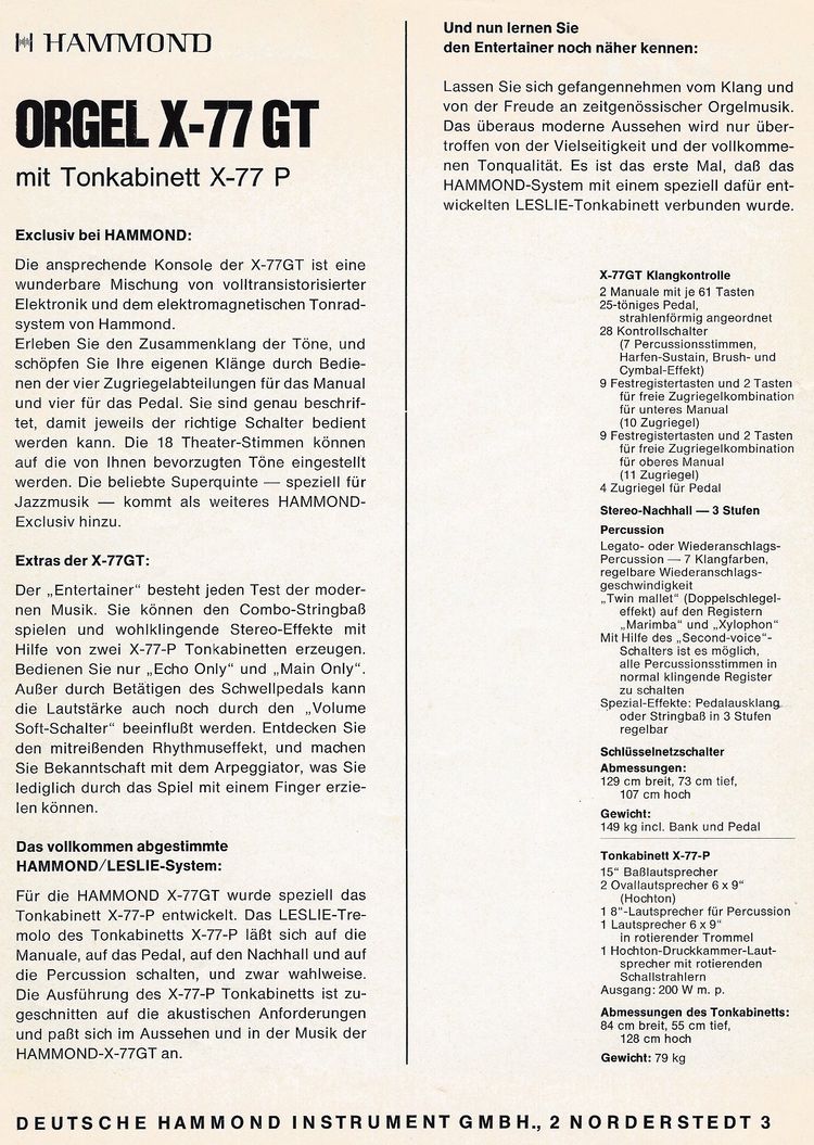 De Hammond X77 / X77GT is werkelijk een van de grote "mastodonten" uit de orgelwereld. Zowel qua afmeting, gebruikte techniek, als in beschikbare mogelijkheden is het werkelijk een indrukwekkende ontwerp prestatie te noemen.