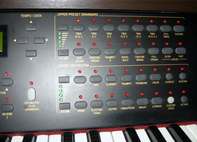Upper Preset Drawbar Tibia 16' 8' 4', Tibia 8' 4', Tibia 8' 2', Tibia 16' 8' 2', Tibia 16' 2', Tibia 16' 8' 4' 2', Full Tibias , Jazz Organ, Percuss. Organ, Trumpet 8, Novel Solo, Theatre Brass, Full Organ.