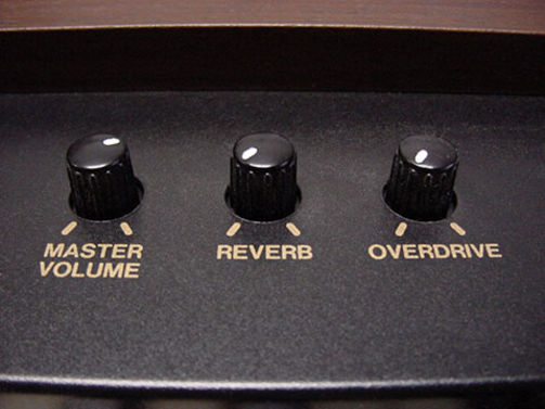 The front panel contains a backlit 24-character LCD screen, as well as the ON/OFF Power Switch, Master Volume, Reverb and Overdrive Control and a group of Touch Tabs for selecting Presets and editing various parameters. Also, there are Touch Tabs for controlling Percussion, 6 degrees of Vibrato and Chorus, Leslie SLOW/FAST/OFF and Keyboard Split ON/OFF.