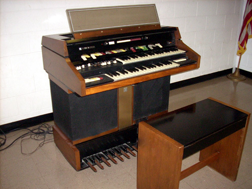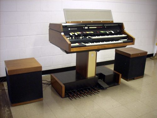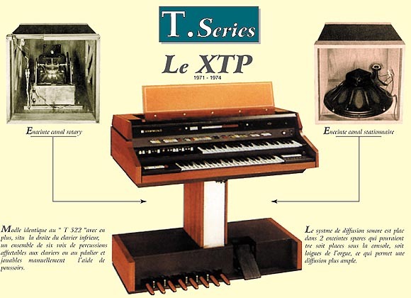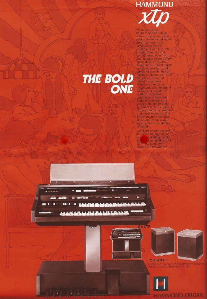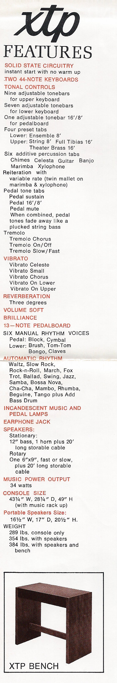 Geheel in tegenstelling tot de logische verwachtingen valt er nog iets speciaals op aan dit instrument. Bij nadere bestudering van de brochure zien we een Hammond vreemd rotary speaker systeem: