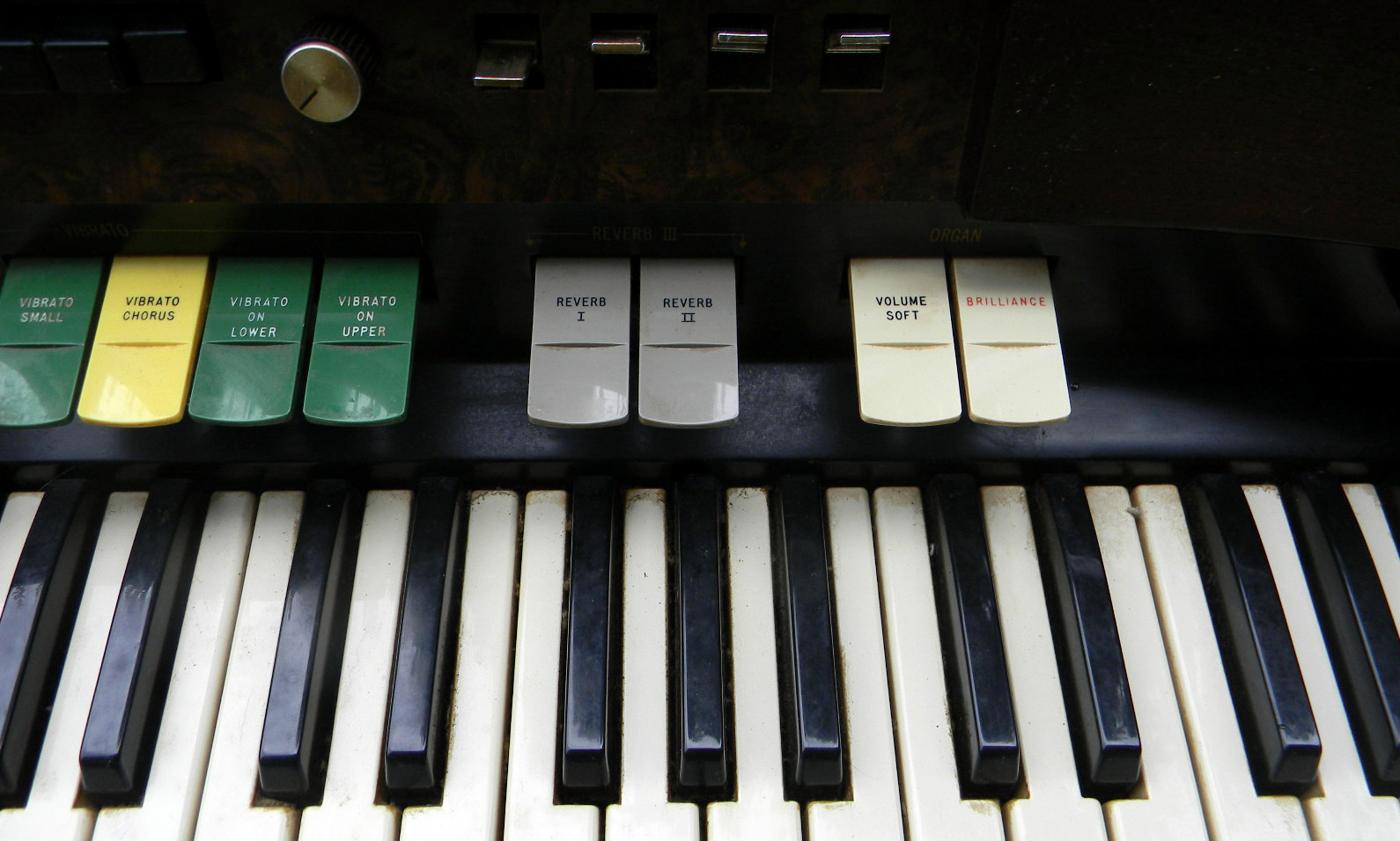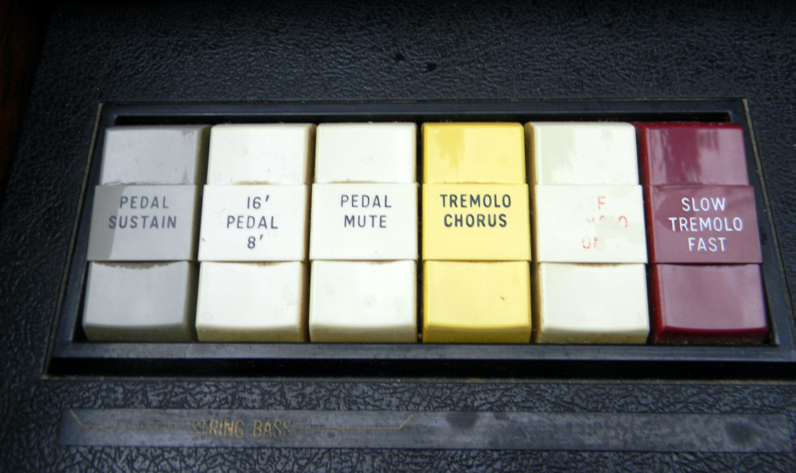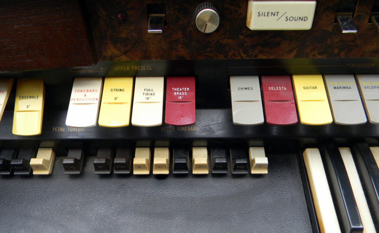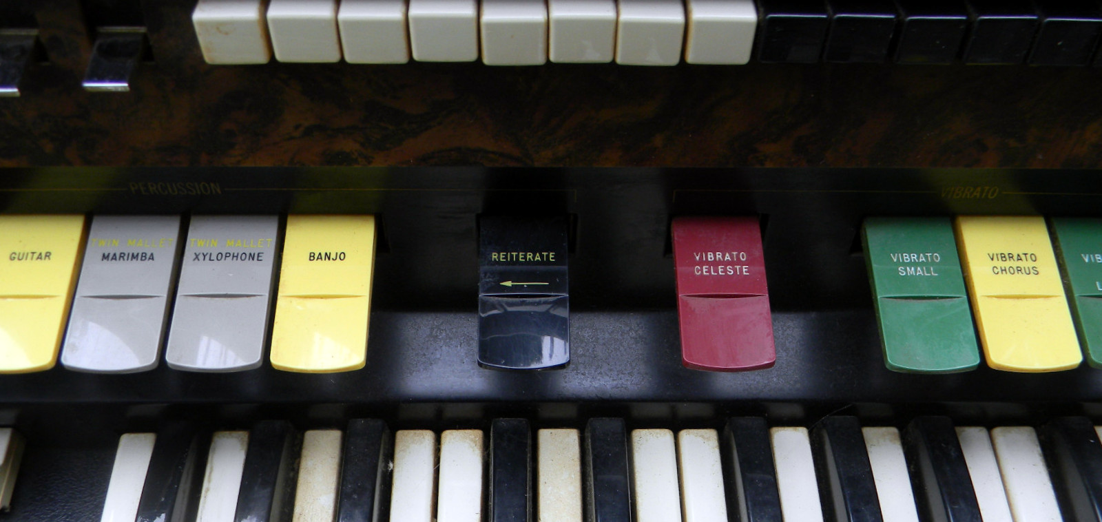 Maar er is iets speciááls aan de hand; want luidsprekerboxen kunnen er aan beide zijden uitgeschoven worden en enkele meters van het orgel geplaatst worden voor een grotere klankspreiding.
