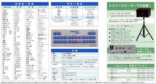 Keyboard Standard keyboard Sound source VASE 3, 128 bit system Tone 14 ensemble sounds, Three bus master tone, 5 tone bus Sound effect 259 tones Drawbars Complete set of 9 drawbars Effect Overall: Reverb, Tone Ensemble: Sub-octave, Vibrato, Sustain Leslie Slow, Percussion, First key click, Tone Bus: Sustain decay Control Volume, octave shift (up or down one octave), rhythm, fine tuning between 438 ~ 442Hz) expression (optional external pedal) and microphone volume Features Custom sound, touch Demonstration Built-in 6 tracks External pin Headphone Output (stereo), External Input (mono phone jack), Output (standard jack L/MONO-R) Mic Input, Expression Pedal, MIDI IN, Power input Output 3W x 2 Speakers 12cm x 2 (stereo) Rated voltage DV10V (AC adapter) Accessories AC Adapter, Music stand, Sheet name sounds marker Maximum Polyphony Sound 48 Keyboard 37 (C 3-octave scale) a standard keyboard, with touch-sensitivity Dimension 60 x 35 x 14 cm Weight 5.3kg
