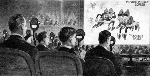 Daartoe verzon Hammond een soort schaduwspel: de rechts/links knipperende projectoren gooiden hun licht op het lege projectiescherm en daarachter bevonden zich danseressen. Doordat de brilletjes en de synchromotoren doordraaiden, verdubbelde het aantal danseressen.