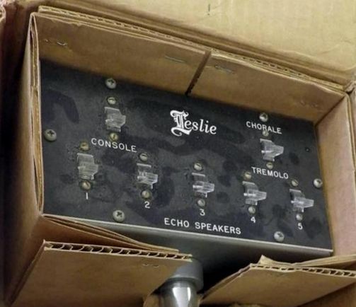 Zoals tegenwoordig in de betere HIFI-winkels kun je vanuit je luie stoel met een schakelpaneeltje van de ene luidsprekerset naar de andere wisselen. Zo was het indertijd ook mogelijk met de grote Leslie-kasten.
