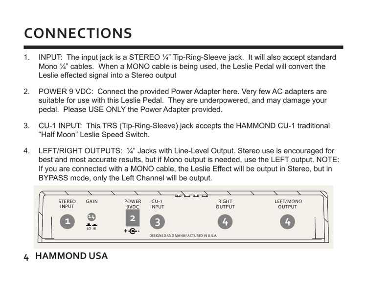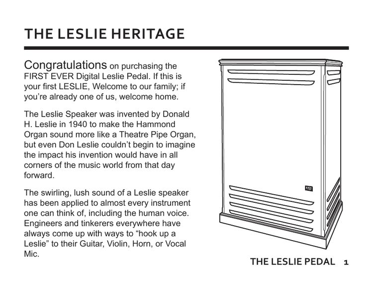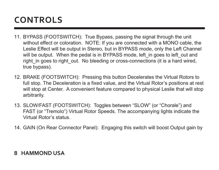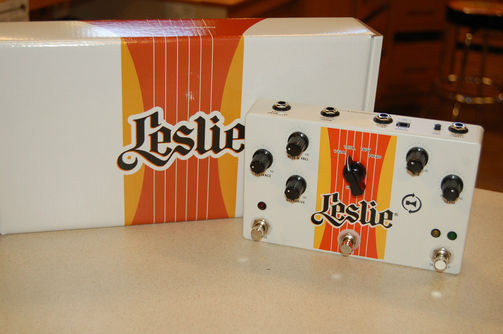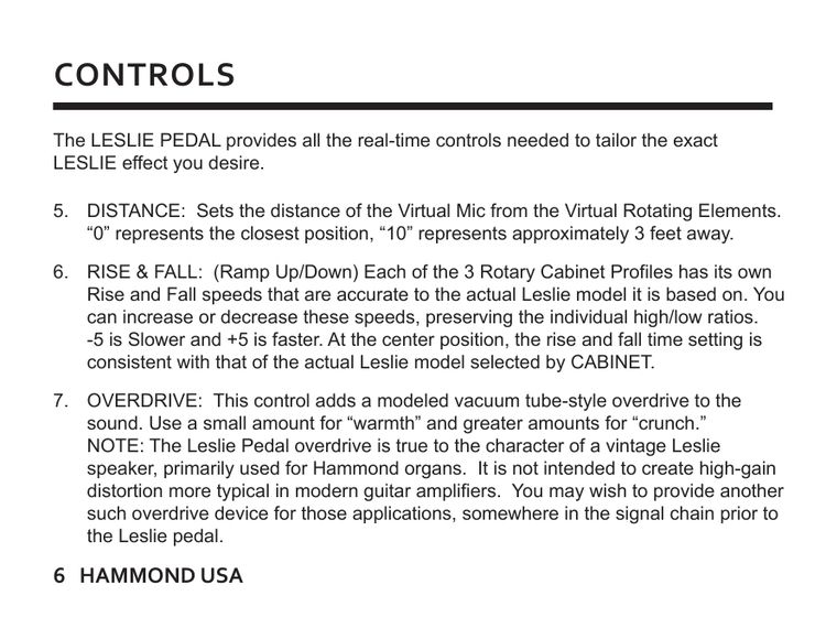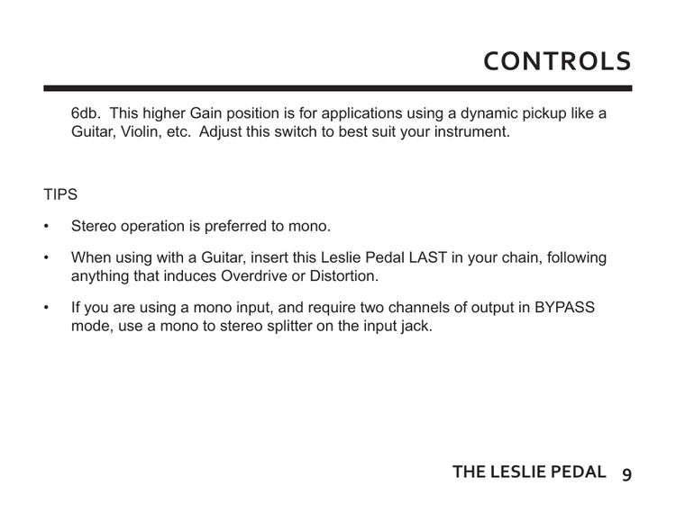 Rotary controls allow adjustment of virtual mic placement, ramp up and down speeds, overdrive, horn and bass balance, EQ and overall volume. Three footswitches provide true bypass, speed and brake control, stereo in/out. A gain switch allows the Leslie Pedal to be used in a guitar effects chain, or direct inject into a sound reinforcement system/keyboard amp.