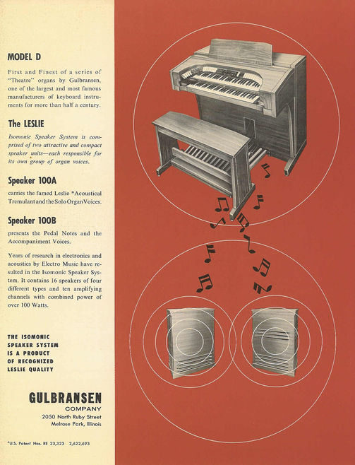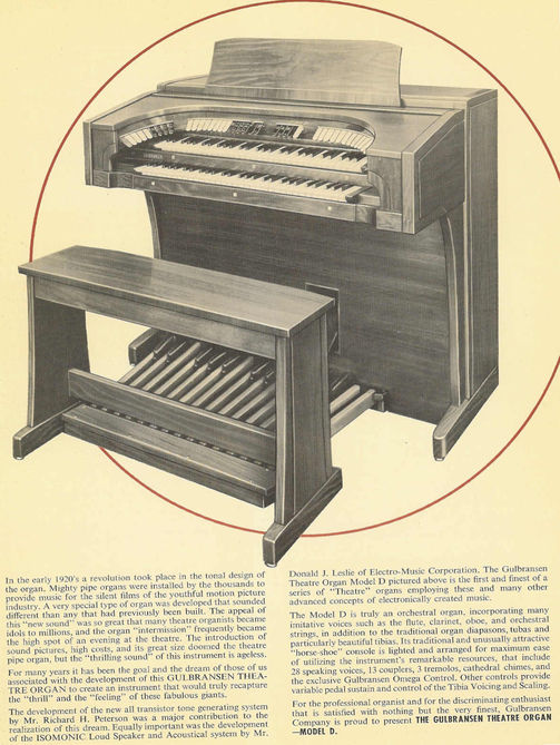 Verder was Gulbransen bezig, met de ontwikkeling van een orgel, dat Model D zou gaan heten. Hiervoor zouden bij Electro-music dan de modellen 100-A en 100-B ontwikkeld worden. Hierbij Model 100-A zou zorgen voor de tibia/flutes en solo-stemmen en Model 100-B voor de bas-tonen en de automatische begeleiding.