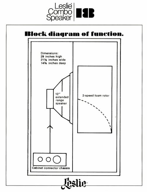 LESLIE 18 WAS IN PRINCIPE GELIJK AAN MODEL 16, MAAR BESCHIKTE OVER EEN FULL RANGE JBL-SPEAKER. OOK DIT MODEL WERD VERKOCHT ONDER DE NAAM FENDER VIBRATONE CABINET.