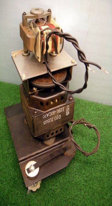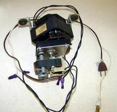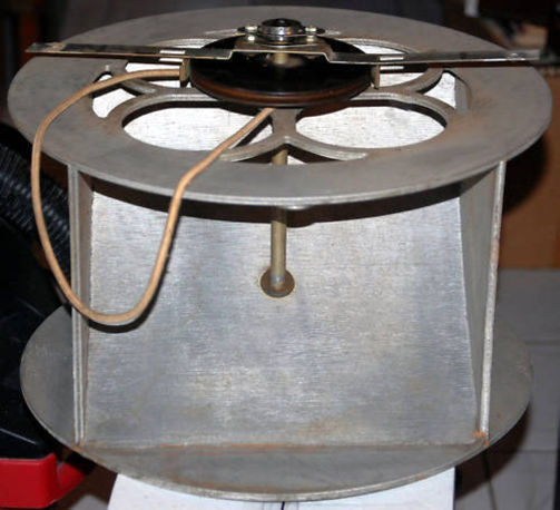 Eerdere modellen hadden een houten rotor, hier met de aandrijfsnaar. Het zwarte doek is hier van de rotor verwijderd. Latere modellen hadden een styrofoam rotor.
