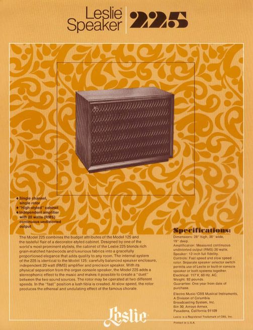 De Leslie 225 is gebaseerd op de Leslie 125 maar nu in de bekende "Decorative" stijl uitgevoerd. Dus de specs. zijn identiek aan de 125 alleen het meubel is anders.