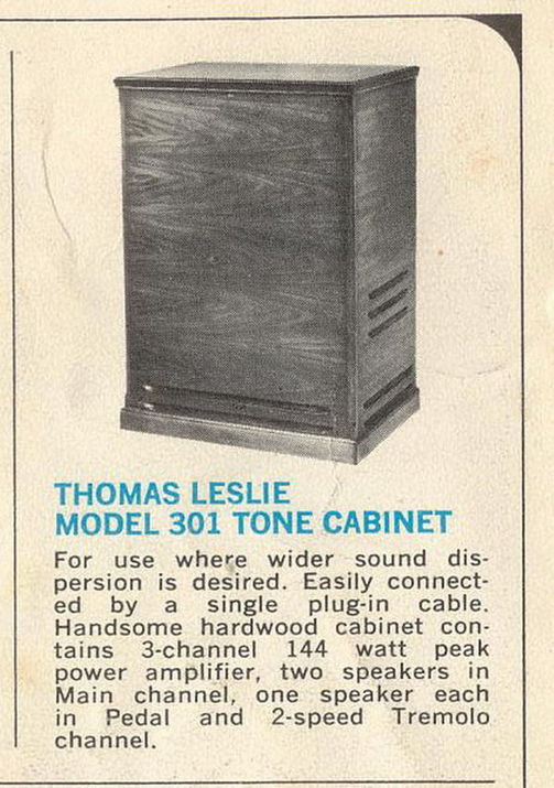 Ook Leslie 301 werd exclusief voor Thomas ontworpen en deze box had veel weg van de 350, want deze was ook voorzien van 4 buizen eindversterkers, samen goed voor 65 Watt. De 350 was in principe voor een Conn bedoeld.