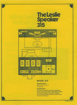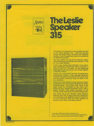 The Model 315 introduces a new portable concept to the Leslie Speaker line featuring genuine Pionex laminated plastic covering and recessed handles. A set of ruggedized casters is available äs an optional accessory. Specifications: