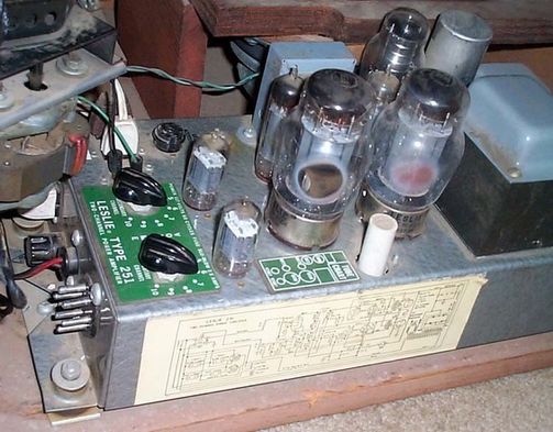 De versterker van deze Leslie is een twee kanalige buizen versterker met 2 maal 6550 eindbuizen voor rotary die 35 Watt leveren en 2 maal 6973 eindbuizen voor stationary, die 20 Watt leveren.
