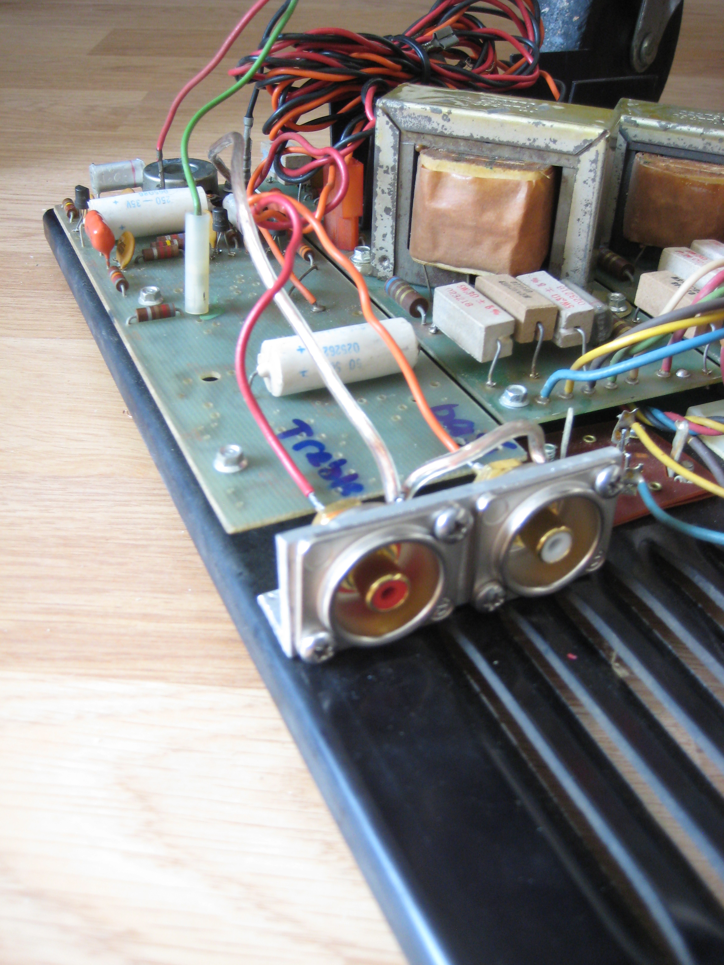 Het is een leslie 770 (transistor) en heb na het crossover filter twee uitgangen gemaakt en daarop een PA eindtrap aangesloten. De eindtrap levert op 8 ohm 2x 160 watt, voor de treble niet nodig, maar wel voor onder. speakers; 15 inch 350 watt onder en een driver van 80 watt. Voor de voeding van de eindtrap heb ik een aansluiting in de leslie gemaakt.