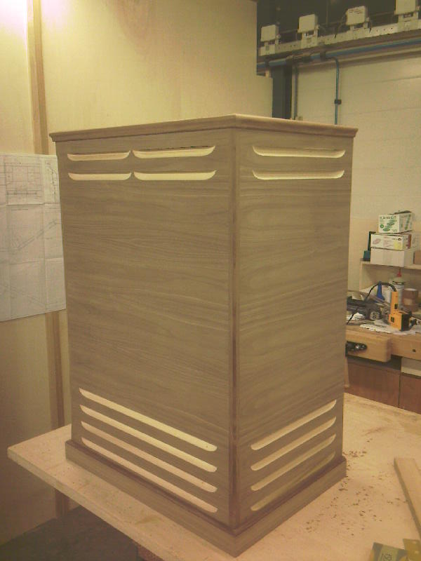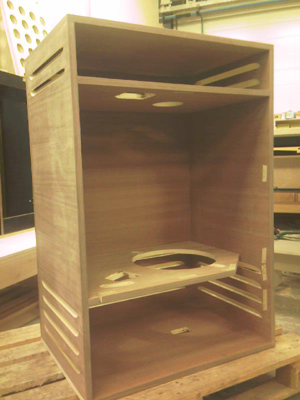 Om een exacte kopie te kunnen maken, heb ik een Leslie 122 van een kennis als voorbeeld gehad. Allereerst heb ik nagedacht hoe ik de sleuven moest gaan frezen. Dit is niet het meeste werk, maar wel lastig om precies de goede vorm te krijgen. Nadat ik de zijpanelen opgebouwd had en gefineerd met Amerikaans walnootfineer, heb ik ze doorgezaagd, de sleuven gefreesd en weer aan elkaar gelijmd.