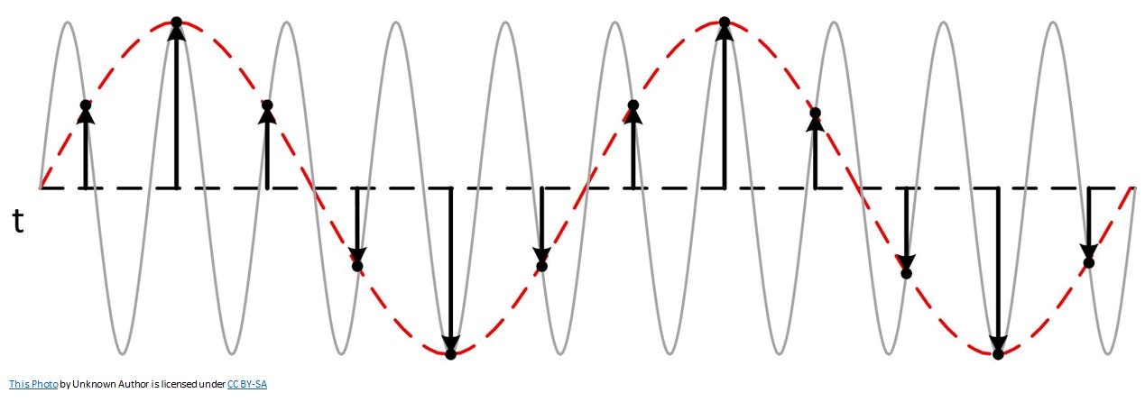 Een andere vraag is, hoe vaak we moeten meten. De kamertemperatuur verandert maar langzaam. Wanneer we 1x/min. meten (bemonsteren) dan is dat ruim voldoende om het verloop bij te houden. Bij geluid is dat echter een heel ander verhaal! Het frequentiebereik van HiFi is 20 .. 20.000Hz (trillingen per seconde). Hoe vaak moeten we nu bemonsteren? Het antwoord is: zo vaak dat het later mogelijk is de originele analoge golfvorm te reproduceren. Bovenstaande figuur laat zien wat er gebeurt wanneer we te weinig monsters (samples) nemen. De grijze sinus is het origineel; de rode gestippelde sinus is het resultaat wanneer we via de samples (zwarte bolpijltjes) de analoge golfvorm reconstrueren. We krijgen dan een "valse" sinus met een lagere frequentie (aliasing). De Amerikaanse elektrotechnicus Harry Nyquist brak zich hierover het hoofd en kwam tot de conclusie dat je in elke volledige periode minimaal twee samples moet nemen. Ofwel de sample-frequentie moet minimaal 2x de hoogste frequentie in het analoge geluidssignaal zijn!