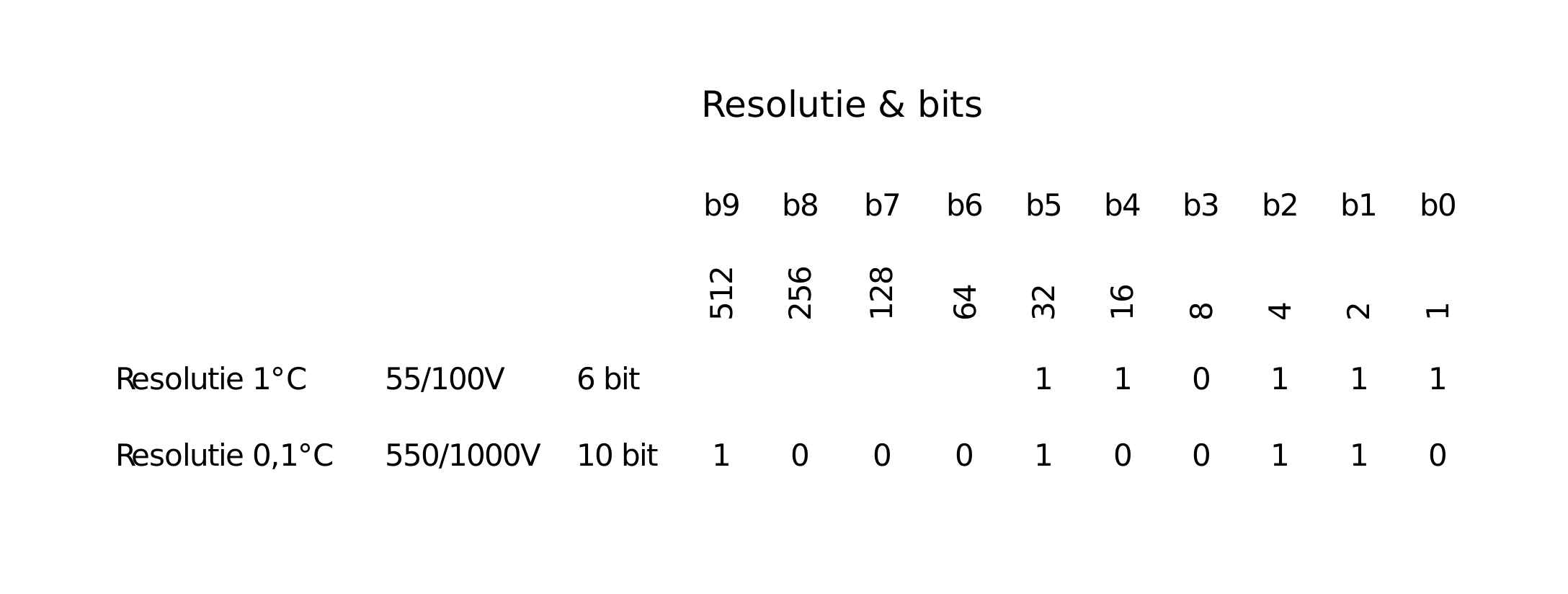 Wanneer echter de temperatuur van 23°C oploopt naar 23,8°C geeft onze digitale meter nog steeds 23°C aan! Pas wanneer de temperatuur boven de 23,9°C komt, springt de aanwijzing naar 24°C. Dat komt doordat we de analoge meetwaarden gedigitaliseerd hebben met een resolutie van 1°C. Alles achter de komma hebben we buiten beschouwing gelaten. Dit wordt de 'kwantiseringsfout' genoemd. Beter zou zijn hier een resolutie (kwantisering) van 0,1°C te kiezen ofwel bij 55°C de spanning uitgedrukt als 550/1000V. Digitaal in bits uitgeschreven is decimaal 550: 1 0 0 0 1 0 0 1 1 0 (10 bit). Conclusie: wanneer we meer detaillering willen, ofwel een hogere resolutie, dan hebben we meer bits nodig!