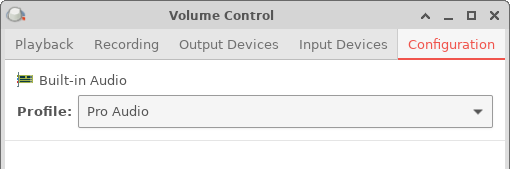 Doordat Pipewire zowel een PulseAudio- als een Jack-interface (API) heeft, kunnen naast Pipewire specifieke tools diverse (niet alle) PulseAudio- en Jack tools gebruikt worden. Met “PulseAudio Volume Control” stellen we het profiel in op “Pro Audio”. (Profiel “Stereo Output” is alleen de HDMI uitgang.)
