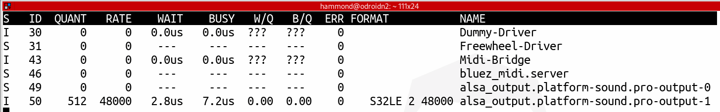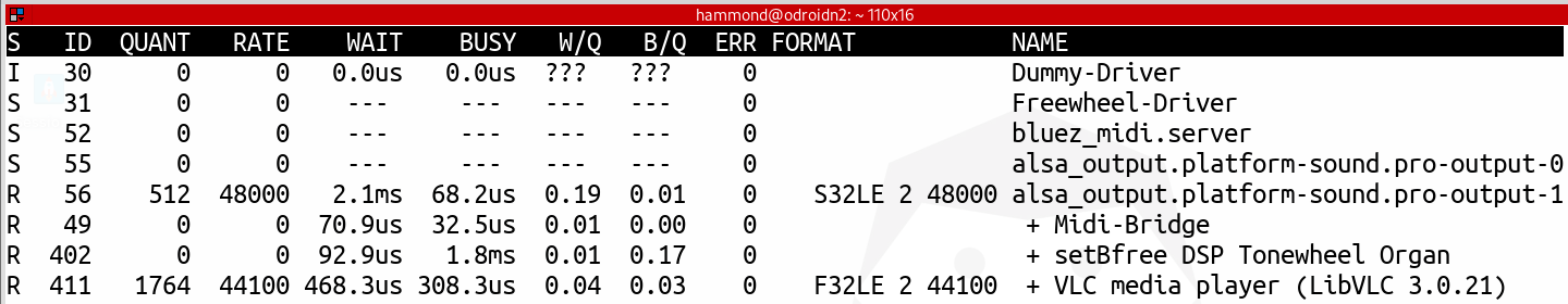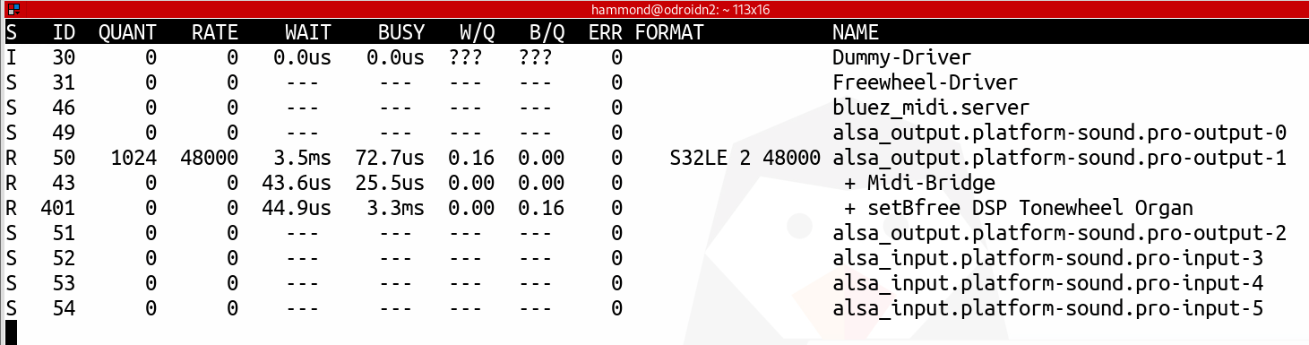 Met “pw-top” kunnen we de live performance van de Pipewire graphs zien. Om een realistisch beeld te schetsen, spelen we een Midi-file af via SetBfree. In onderstaande screenshot zien we dat uitgang “pro-output-1” (DAC) ingesteld staat op een sample rate van 48kHz. De framebuffergrootte (quantum) is 1024 frames. De cyclustijd van de graph processing is te bepalen door het quantum te delen door de sample rate: 1024 / 48kHz = 21.3ms. 6 SetBfree heeft ca. 3ms (BUSY) nodig om zijn taak te completeren (waardes fluctueren). De totale processing tijd van de graph is 3.5ms (kolom “WAIT” pro-output-1). De belasting is dus laag: 3.5ms / 21.3ms = 0.16 (W/Q). (Zie voor uitleg van de velden: man pw-top)