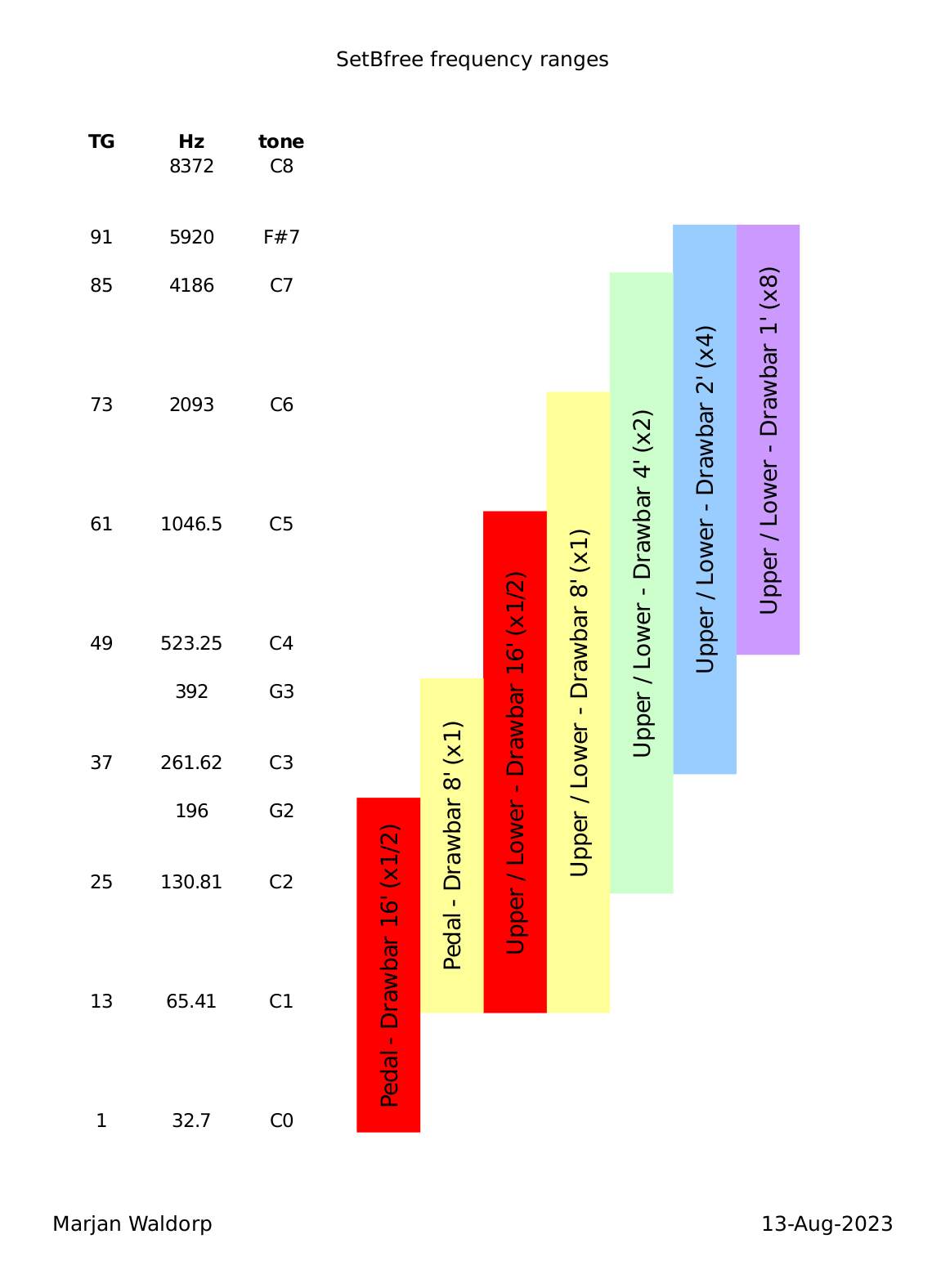 Het SetBfree software synthesizer Hammond orgel emuleert met zijn 91 digitale oscillatoren het volledige toonbereik van de Hammond B3 van C0 (32,7Hz) t/m F#7 (5920Hz)! Merk op dat SetBfree ook keurig de “foldback” emuleert van de 16-voet op het onderste octaaf van de klavieren!