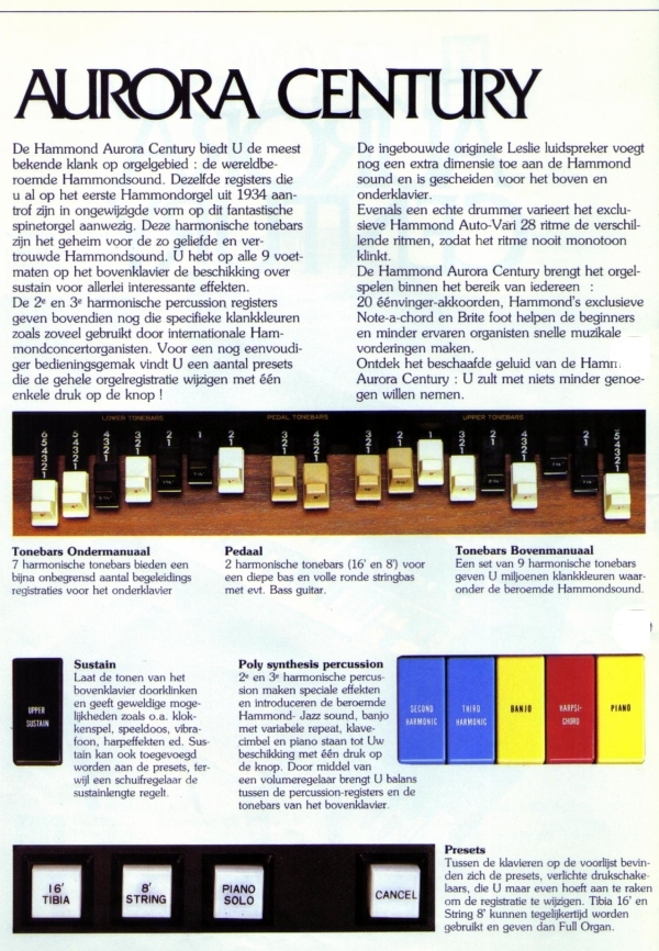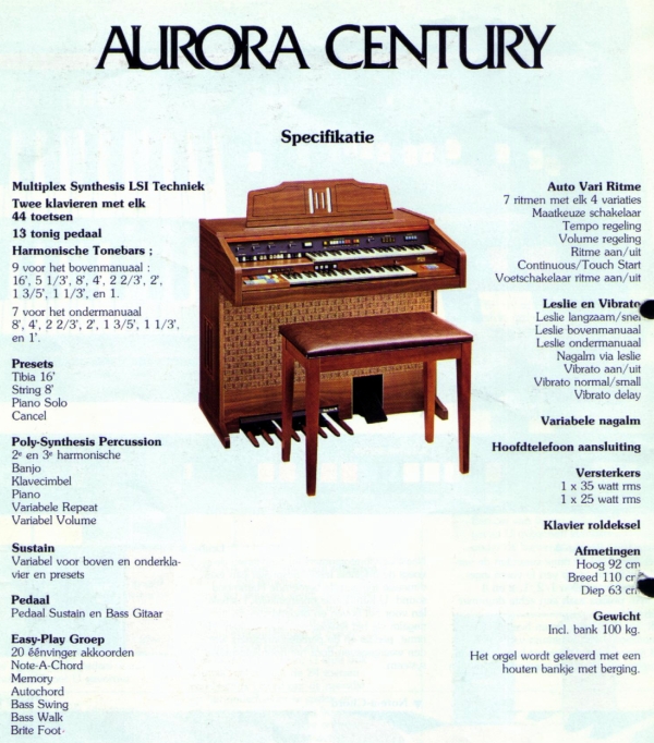De Aurora Century was qua meubelgrootte een gemakkelijk te plaatsen orgel, dat ondanks de beperkte afmetingen toch behoorlijk veel mogelijkheden bood.