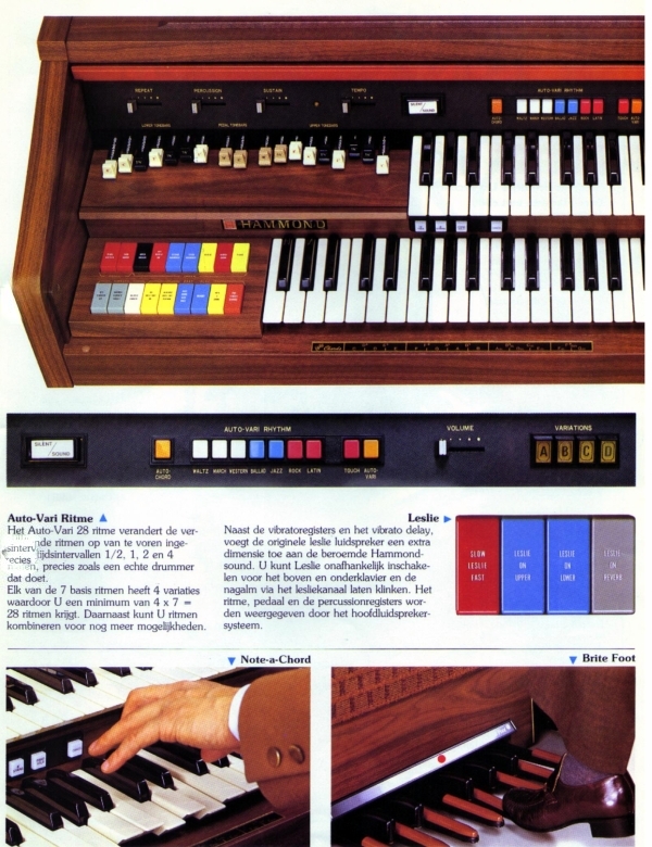 Overigens: er zijn nogal wat Hammond orgels waar de Leslie chorale/tremolo schakelaar in het register paneel is opgenomen, waaronder de Aurora 8122, 8222, Monarch, Grandee, Concorde, Commodore, Colonnade, Elegante en de Aurora Classic etc.